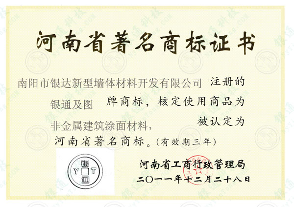 注: 此證書(shū)有效期三年,目前已失效,本介紹頁(yè)僅為方便用戶(hù)了解企業(yè)歷史資質(zhì),望悉知 河南省著名商標(biāo)證書(shū) 南陽(yáng)市銀達(dá)新型墻體材料開(kāi)發(fā)有限公司 注冊(cè)的銀通及圖(銀通·YT)牌商標(biāo),核定使用商品為非金屬建筑涂面材料,被認(rèn)定為河南省著名商標(biāo)。(有效期三年) 河南省工商行政管理局 二〇一一年十二月二十八日