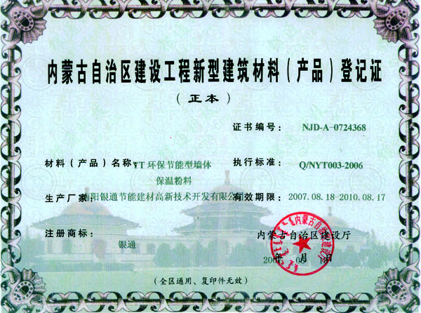 內蒙古省建筑節能產品核準證書 有效期限:2007.08.18-2010.08.17