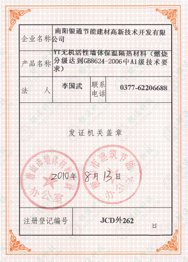 河北省唐山市建筑工程材料進市登記證書 唐山市墻體材料革新辦公室 唐山市建筑節能辦公室 企業名稱南陽銀通節能建材高薪技術開發有限公司 產品名稱YT無機活性墻體保溫隔熱材料 燃燒分級達到GB8624-2006中A1級技術要求 發證機關 唐山市墻體材料革新辦公室 唐山市建筑節能辦公室 注冊登記編號 JCD外262