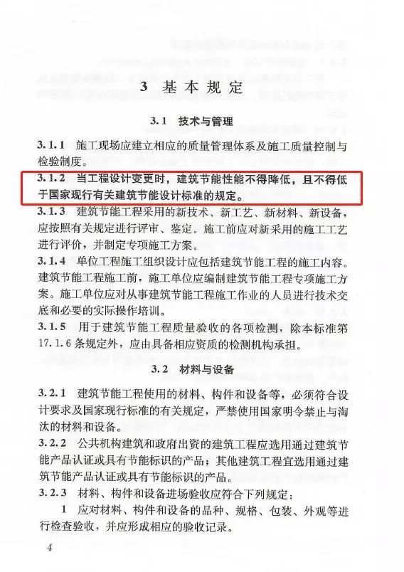 3.1.2:當工程設計變更時,建筑節能性能不得降低,且不得低于國家現行有關建筑節能設計標準的規定。