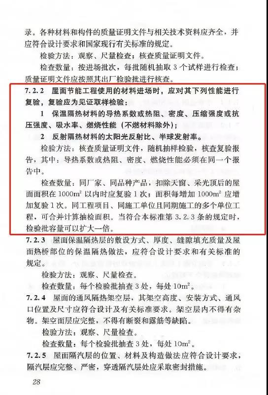 7.2.2:屋面節能工程使用的材料進場時,應對其下列性能進行復驗,復驗應為見證取樣檢驗:1.保溫隔熱材料的導熱系數或熱阻、密度、壓縮強度或抗壓強度、吸水率、燃燒性能(不燃材料除外);2.反射隔熱材料的太陽光反射比、半球發射率。