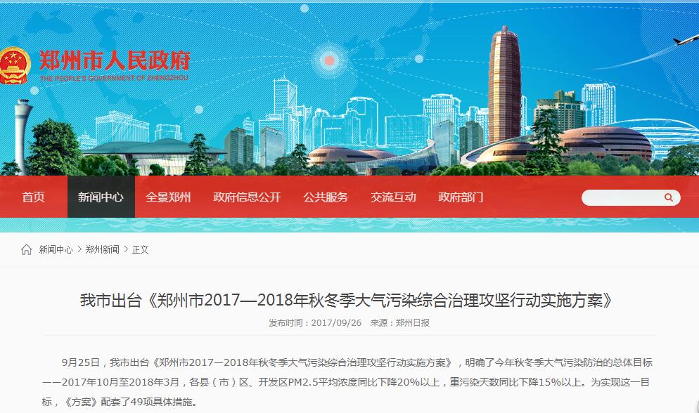 為了配合環境保護部、國家發展和改革委員會、工業和信息化部、公安部、財政部、住房城鄉建設部、交通運輸部、工商總局、質檢總局、國家能源局十部委聯合北京市、 天津市、河北省、山西省、山東省、河南省共同發布《京津冀及周邊地區2017-2018年秋冬季大氣污染綜合治理攻堅行動方案》,9月25日,鄭州市出臺《鄭州市2017—2018年秋冬季大氣污染綜合治理攻堅行動實施方案》,明確了2017年秋冬季大氣污染防治的總體目標——2017年10月至2018年3月,各縣(市)區、開發區PM2.5平均濃度同比下降20%以上,重污染天數同比下降15%以上。為實現這一目標,《方案》配套了49項具體措施,其中,涉及建材行業的有: