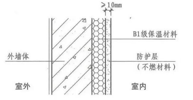 建筑內(nèi)保溫人密(人多,發(fā)生火災(zāi)不利于疏散),用火油氣(火災(zāi)危險(xiǎn)性大的場(chǎng)所),疏散通道(著火了要從這些地方跑或避難)采用A級(jí);其他B1級(jí)并且因?yàn)槭鞘覂?nèi)如果產(chǎn)生有毒煙氣會(huì)造成人員傷亡要求低煙低毒。下圖為內(nèi)保溫采用B1級(jí)材料時(shí),防護(hù)層設(shè)置示意圖。
