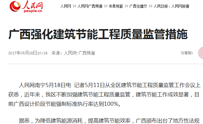 人民網南寧5月18日電 記者5月11日從全區建筑節能工程質量監管工作會議上獲悉,近年來,我區不斷加強建筑節能工程質量監管,建筑節能工作成效顯著,目前廣西設計階段節能強制標準執行率達到100%。